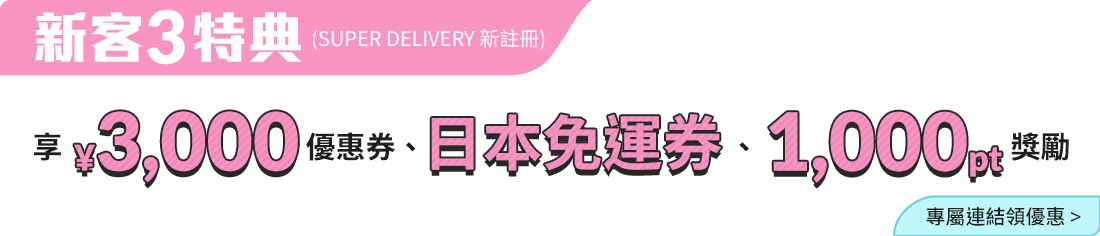 ● 優惠二【新客 3 特典】: 透過「專屬連結」註冊之 SD 新會員。可於 SD 帳戶領取¥3,000 優惠券、日本免運券、1,000pt。