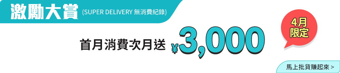 ● 優惠三【激勵大賞】: 限 SD 無消費紀錄者。限四月於 SD 完成首單批發並付款,次月將於 SD 帳戶獲贈¥3,000 折價券。